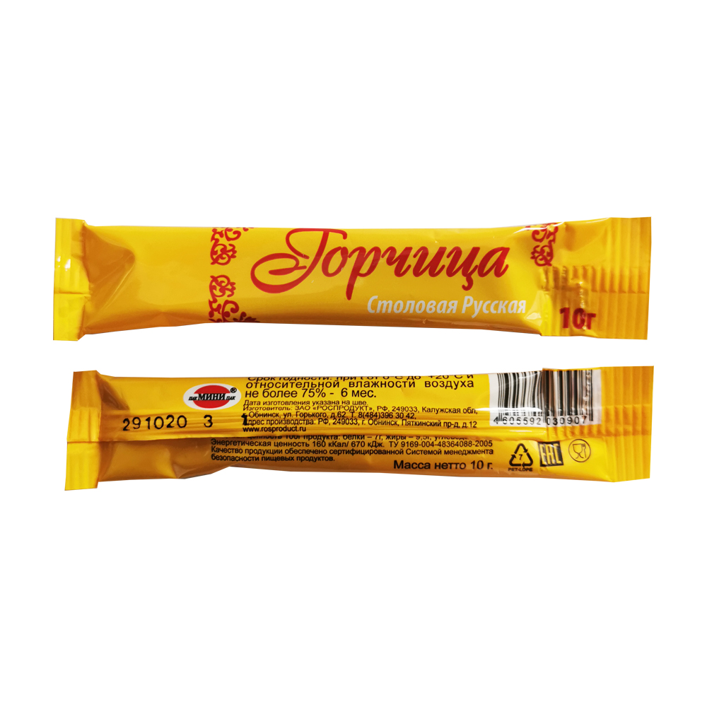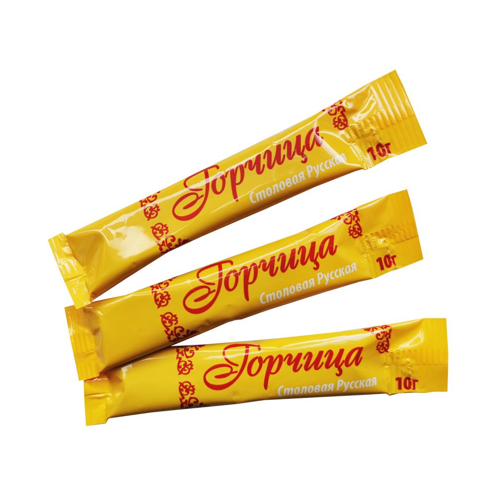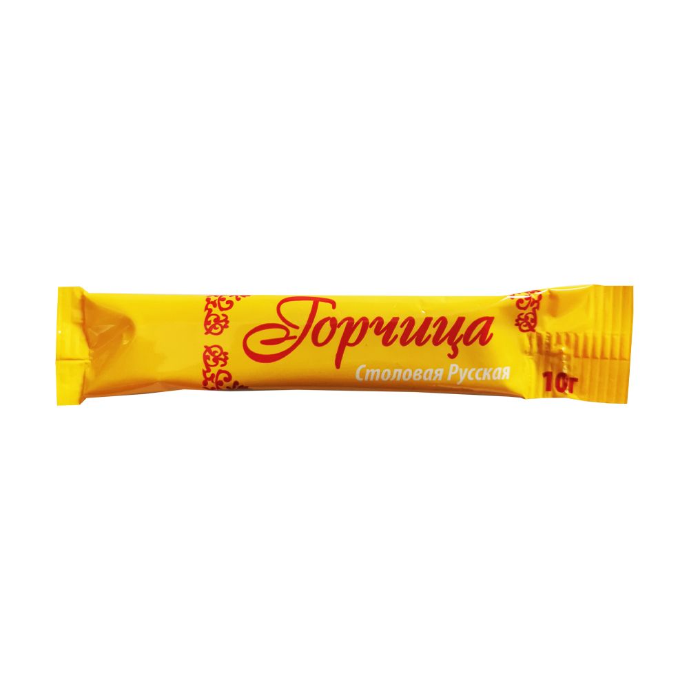 Горчица — одна из самых популярных приправ немецкой и русской кухни."Русская" порционная горчица отличается особенной остротой, насыщенным ароматом и ярко выраженным вкусом. Горчица повышает аппетит, усиливает выделение желудочного сока, что приводит к гораздо лучшему пищеварению, и порционную горчицу действительно стоит употреблять в пищу во время простуд. Также принесет пользу тем, кто хочет похудеть: в ней содержатся вещества, расщепляющие жиры.